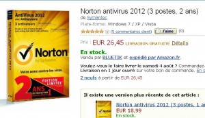 Si vous avez plusieurs pc chez vous et qu’il vous faut un antivirus, sur amazon on peut acheter via un vendeur tiers Norton Antivirus 2012 version 3 postes avec mise à jour durant 2 ans pour 26.45 euros port inclu ..