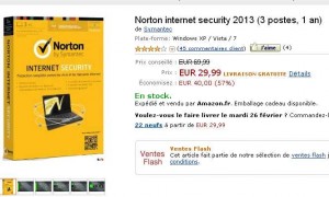 Si vous cherchez une solution de protection antivirus globale pour protéger plusieurs pc, offre interessante du coté d’amazon encore une fois : en vente flash jusqu’au 3 mars 2013, il y a la boite Norton Internet Security 2013 pour 3 postes et 1 an de mise à jour