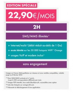 A compter du 15 decembre et jusqu’au 8 fevrier , Sosh propose  un nouveau forfait mobile tres interessant : 22 euros 90 par mois sans engagement pour un forfait proposant 2 heures de communications mobiles, sms mms illimités , 1Go de traffic internet (avec debit reduit au dela) , avec usage voip et modem inclus ..