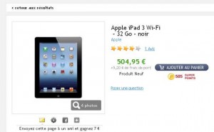 Ainsi le nouvel ipad 16go wifi est proposé à 422,95 + 9.2 euros de frais de port soit donc 432.15. En utilisant le code promo le prix passe donc à 412,15 euros .. Cliquez ici pour voir l’ipad3 16go wifi sur priceminister