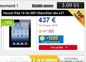 Si vous désirez avoir la tablette Ipad d’apple , vous pouvez peut etre faire une bonne affaire sur priceminister .. En effet jusqu’à 20 heures le 10/10 elle est donc en vente flash à 446 euros port inclu (437+9.2 de fdp) .. Mais on recoit pour son achat 1500 superpoints soit donc 15 euros de bons d’achats pour des achats futurs sur pm..