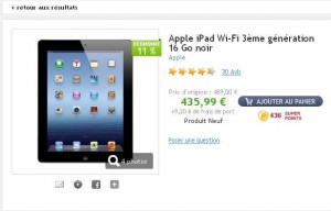 Et sur priceminister on trouve déjà des ipad à des super prix .. Ainsi par exemple l’ipad noir ou blanc 16go wifi sont à 435.99 + 9.2 de frais de port soit donc 445.19 .. Et font donc l’objet de plus de 8700 superpoints soit donc plus de 87 euros de bons d’achats ..