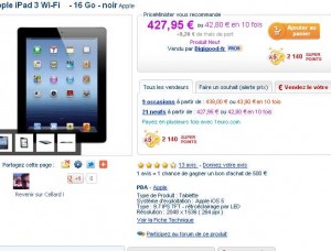 Nouvel Ipad3 16go wifi à 437 euros port inclu mais avec en prime 21 euros de bons d’achats