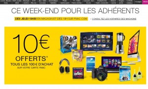 Offre fnac: 10 euros offerts par tranche de 100 pour les adherents jusqu’au 7 avril