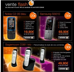 Nouvelle vente flash orange du 10 avril à 19 heures jusqu’au 12 avril à 23h59 : avec à nouveau plusieurs mobiles en formules sans engagement mobicartes de proposés : notamment le nokia c2-05 à 19.9 euros avec une carte mobicarte contenant 5 euros de crédit de communication … Telephone portable coulissant avec radio fm , lecteur mp3 (lecteur de carte ) … telephone qui se vend en nu autour de 50 euros ..