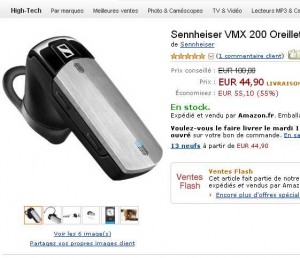Une autre offre en vente flash peut être intéressante sur amazon : une oreillette Senheiser VMX200 est proposée à 44.90 euros port inclu … Quand on compare les prix on s’apercoit qu’elle se vend plutot entre 80 -100 euros .. Cependant elle est surtout vendue ailleurs sur des petites boutiques en ligne ..