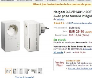 Si vous désirez des plugs cpl , nouvelle vente flash sur amazon concernant les boitiers cpl de la marque netgear : 29.9 euros port inclu , le lot de 2 boitiers 200 mbits avec prises femelles