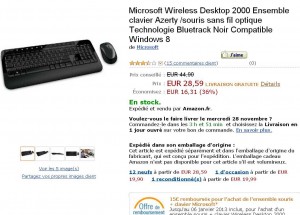 En effet le pack clavier + souris microsoft desktop2000 est à 28.59 euros port inclu .. Mais pour un achat d’ici le 6 janvier 2013 , microsoft rembourse 15 euros , ca fait donc un prix de revient final de moins de 15 euros …