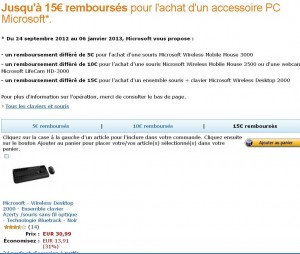 Si à force de les utiliser le clavier et la souris de votre pc commencent à montrer des signes de fatigue, sachez que vous pouvez en changer pour pas cher : en effet microsoft propose 15 euros de remboursement différé sur l’achat de son pack souris + clavier sans fil Wireless Desktop 2000 … Et celui ci se vend autour de 30 euros .. 30.99 euros pour etre precis sur amazon ..
