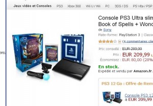 Si vous désirez une console Sony PS3 , très bonne affaire pour vous du coté d’amazon .. En effet le site vend en vente flash le pack Playstation 3 12go avec le jeu Book of Spells avec playstation move pour 209.99 euros contre entre 250 et 290 euroos ailleurs ( 259 sur le site de la fnac par exemple=
