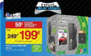 Si vous desirez une console xbox360 , super affaire dans les hyper carrefour du 10 au 16 octobre .. En effet le pack XBOX360 250go avec les jeux forza4 et skyrim est à 199 euros seulement ..