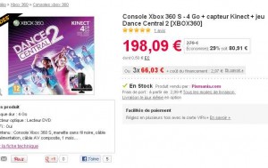 Super affaire si vous desirez une console xbox360 … le pack comprenant la console xbox360 4Go + le capteur kinect + le jeu dance central 2 et aussi le jeu kinect adventures est à 201 euros livraison incluse en point relais dans les soldes sur pixmania ..