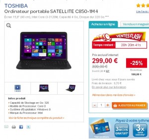 Très bon prix sur le site carrefour pour un pc portable : 299 euros le pc portable toshiba SATELLITE C850-1M4 .. un ordinateur avec ecran de 15 pouces, un processeur core i3 sous windows 8 .. 4go de mémoire vive .. Par contre il n’a qu’un petit disque dur de 320go ..