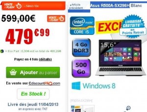 Sinon sur cdiscount, en vente flash le 9 avril à 479.99 euros , il y a l’Asus R500A-SX296H qui dispose d’un graveur de dvd , 2 ports usb3 .. Cliquez ici pour voir ce pc portable asus
