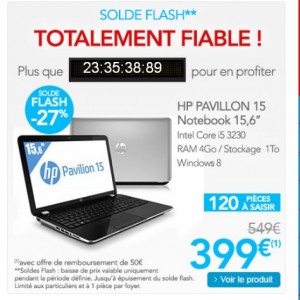 Bon prix de revient le 9 janvier sur rueducommerce pour un ordinateur portable HP à base de processeur puissant core i5 .. Le Pavilion 15-E058SF est en effet soldé à 449 euros mais dans la limite de 120 pieces .. En plus hp rembourse 50 euros en différé , son prix de revient ne sera donc au final que de moins de 400 euros ..