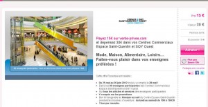 Pour les franciliens : 15€ le bon d’achat de 30 valables dans les boutiques de 3 centres commerciaux ( Bercy2 , Italie2 ,Saint Quentin Ouest)