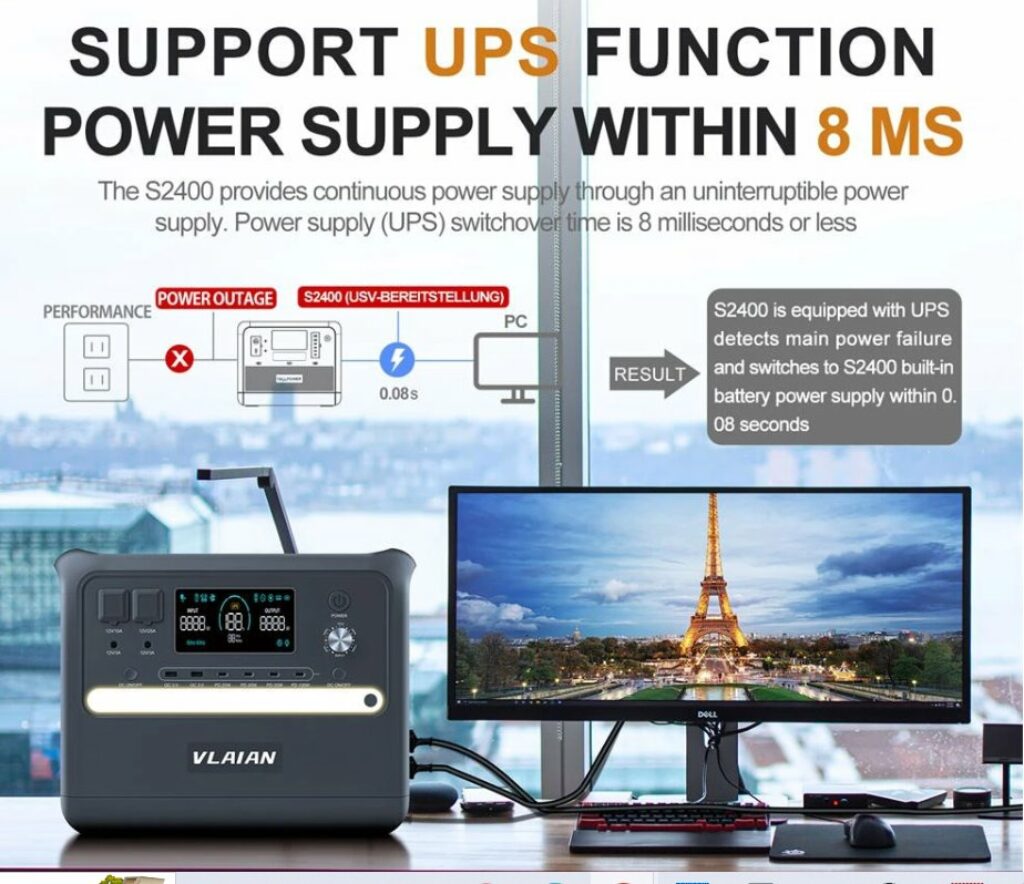 Le Vlaian S2400 possede une fonction onduleur / ups , on peut donc l’intercaler entre une alimentation secteur et des appareils et en cas de coupure la powerstation prendra le relais quasi instantanément