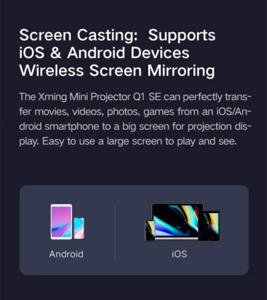 A noter que l’affichage avec le vidéo projecteur XMING Q1 SE se fait depuis une source externe HDMI ( en branchant par exemple une box android , ou un lecteur de blu ray , dvd , une console de jeux … ou alors en castant l’image d’un smartphone .. L’appareil n’est pas android