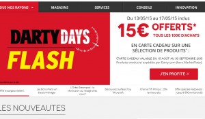 15 euros offerts par tranche de 100 euros d’achats sur le site darty … les 15 euros sont offerts sous forme de bons d’achats ..
