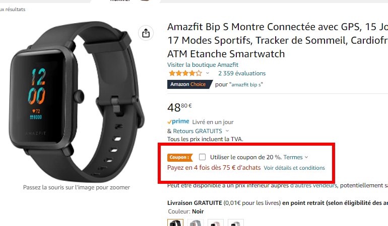 Sur Amazon on peut acheter la Smartwatch AMAZFIT BIP S pas cher pour 39€ seulement en profitant d’un coupon de réduction qui donne 20% de réduction sur le prix de base de 48€ .. Tres bonne affaire donc pour une montre que l’on pourra enmener pour faire du sport sans obligtoirement à avoir à enmener son smartphone …
