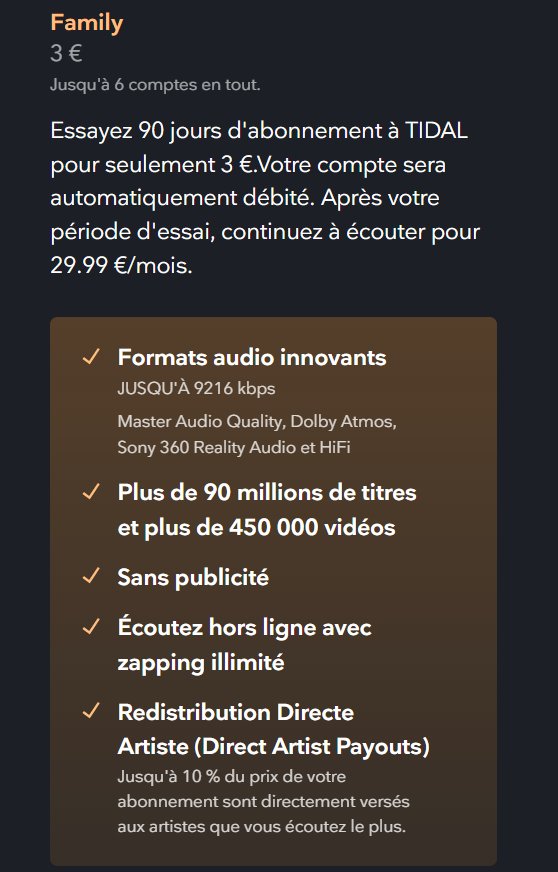 mais encore mieux avec l’offre TIDAL FAMILY jusqu’à 6 appareils et de meme 3€ pour 3 mois au lieu de 99.99€ !