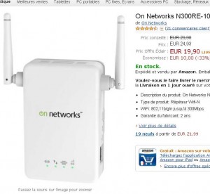 les ventes eclairs se ressemblent sur amazon en ce qui concerne le type de produits vendus : à nouveau le 3 septembre, on a un repeteur wifi en promo : 19.9 euros port inclu le repeteur de la marque On Network .. Repeteur wifi n jusqu’à 300 mbits .. Repeteur disposant d’un port Rj45 permettant aussi de brancher directement un appareil ne disposant pas de wifi au reseau ..
