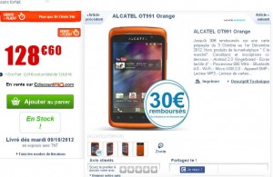 En effet sur cdiscount, cet androidphone est à 128.60 euros livraison incluse en point relais .. et comme dans le même temps alcatel propose 20 euros de remboursé en carte prepayée visa sur l’achat de ce mobile .. cela fait donc un prix de revient final de 108.60 euros ..