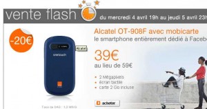 Alors que le smartphone android Alcatel OT908F est vendu 99 euros chez sosh  , il est proposé à 39 euros en vente flash chez orange  avec son offre prépayée du 4 /04 à 19 heures jusqu’au 5/4 à 23h59..