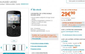 Super offre pour un mobile android .. Chez bouygues est en effet vendu en formule carte prépayée le HUAWEI U8350 Boulder à 59.90 euros ..