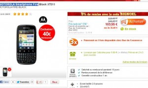 Si vous cherchez un smartphone android pas cher à clavier , peut etre serez vous interessé par le motorola Fire .. Ce smartphone à clavier est donc sous android 2.3 , ecran 2.8 pouces, appareil photo 3 millions de pixels, processeur 600mhz .. Alors qu’il se vend couramment encore autour de 130 euros, il est sur rueducommerce à 103.55 euros livraison incluse en point relais ..