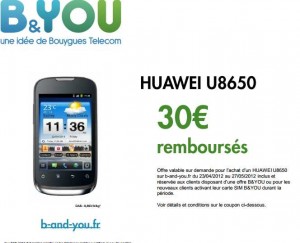 Le smartphone android Huawei 8650 coute en nu autour de 120 – 130 euros , mais pour un abonnement sans engagement à B and you on peut l’obtenir pour un prix de revient de 82 euros :