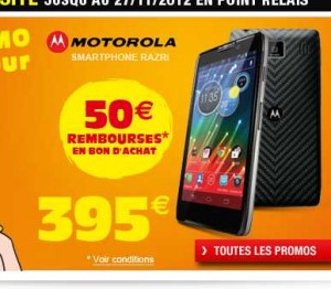 Bonne affaire sur auchan.fr concernant le smartphone haut de gamme Motorola Razr i .. En effet celui ci qui se vend un peut partout autour de 400 euros, est proposé à 395 euros sur auchan.fr mais avec en prime 50€ de bons d’achats offerts à utiliser sur une prochaine commande sur le site ..