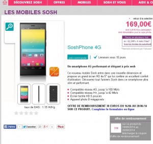 Sosh propose un nouveau smartphone sous son nom … Le Soshphone 4G qui propose un ecran 5 pouces, un proc quad core à 1.2 ghz, 1go de mémoire vive … Vendu en precommande à 169 euros … Pour un achat entre le 16 et le 20 juin avec la souscription d’un forfait sosh on beneficie de 30 euros de remboursement en différé …