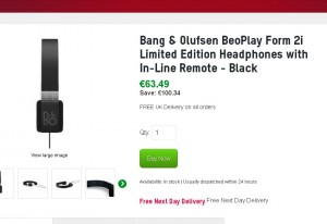 A priori un super prix pour des casques audio de la marque Bang & Olufsen … 63.49 euros port inclus le casque BeoPlay Form 2i … un casque que l’on peut voir sur de nombreuses boutiques en ligne françaises mais à plus de 100 euros ( 105 au mieux sur amazon , 129 chez darty , boulanger , webdistrib ) …