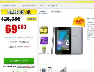 A la recherche d’une tablette tactile de marque pas chere ? super affaire sur cdiscount qui propose en solde la HP SLATE 7 à 69.82 euros livraison incluse en point relais .. Une tablette 7 pouces avec processeur dual core à 1.6 ghz, 1 go de mémoire vive, 8go d’espace de stockage extensible .. Une tablette sous android