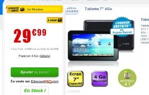 Une tablette en vente flash sur cdiscount à moins de 30 euros .. 500 exemplaires seulement .. Une tablette simple coeur de 1.2 ghz, ecran 7 pouces (800 x480 ) , 512 mo de mémoire vive sous android 4.1 , avec une petite webcam , 4go d’espace de stockage extensible …