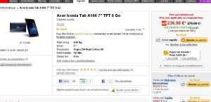 La tablette Acer Iconia A100 est soldée à 236,90 (et 245 avec les frais de port) à la fnac au lieu de 276,90 … et effectivement son prix un peu partout tourne entre 270 et300 euros … donc si vous cherchez une tablette android  7 pouces performante, ca doit etre actuellement le prix le plus bas que l’on peut trouver