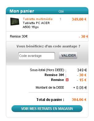 Cliquez ici pour aller sur la fiche article de l’acer iconia a500 sur boulanger (elle est indiquée à 349 mais avec 30 euros de remise immediate puis 15€ en utilisant le code reduc)