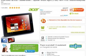 Alors que la tablette android iconia tab a100 se vend plutot entre 280 – 320 euros ( 281 sur amazon, 299 chez darty … ) , elle est vendue seulement 249 euros chez rueducommerce avec la livraison en point relais offerte ..