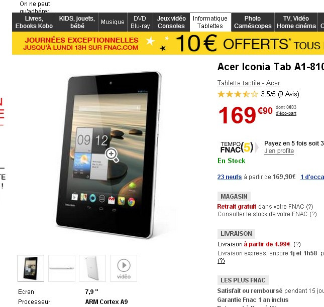 Tablette Acer quad core 7.9 pouces à 122.55 euros port inclus