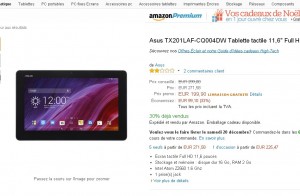 Bon plan tablette tactile sur amazon en vente eclair le 19 decembre : l’asus TX201LAF-CQ004DW est à 199 euros .. Une grande tablette 11 pouces, processeur Intel Atom Z2560, 2go de mémoire vive que l’on voit ailleurs autour de 280 euros ( fnac, darty, carrefour , auchan ….)