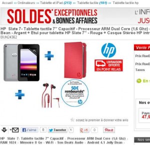 tablette hp slate 7A la recherche d’une tablette tactile de marque pas trop chère ? Offre interessante concernant la HP SLATE 7 sur rueducommerce : le site propose en effet un bundle tablette + etui + écouteur à 139 euros .. En plus HP propose 50 euros de remboursement en différée sur sa tablette qui revient donc ensuite à moins de 90 euros ..