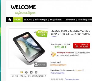 Vous desirez une tablette tactile ? Bonne affaire ce soir 29 septembre sur priceminister de 20h à 21 heures : en effet on a la tablette Lenovo ideatab 1000 vendue 130 euros .. Mais avec en plus une offre de remboursement différée de 30 euros .. Elle revient donc à 100 euros ..