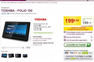 La tablette tactile android folio 100 de toshiba est l’un des plus anciennes presente sur le marché puisqu’elle est sortie il y a plus d’un an .. Cependant elle dispose d’un processeur dual core 1Ghz ( Tregra250 dual core de 1ghz ) , le meme qui equipe de nombreuses tablettes bien plus recente et est sous android 2.2 meme si à priori il existe une mise à jour (non officielle ?) vers honeycomb..