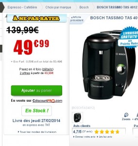 Par ailleurs pour un achat d’une tassimo (hors T20 ) d’ici le 9 mars 2014 , et l’achat de 3 paquets de capsules dans les 3 semaines qui suivent , on a un remboursement de 50 euros de la part de Tassimo ..