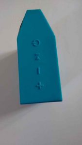 Concernant l’enceinte, elle dispose sur le dessus de 4 boutons : un bouton de mise en marche, boutons + et – permettant à la fois de monter et baisser le volume mais aussi de passer à la chanson suivante ou précedente d’une play list ..