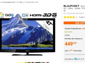 Bon prix pour une tv 3d 47 pouces : sur rueducommerce on peut voir la tv blaupunk BLA47/187I à 399 euros ( 449 euros – 50 euros avec le code 50GOCLIC ) … Il faudra cependant ajouter 30 euros de frais de port ..