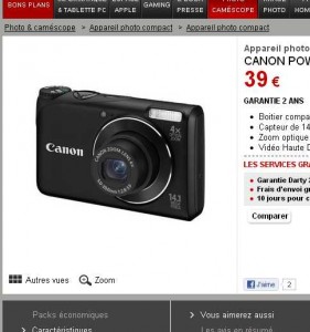 Très bonne affaire sur le site darty qui vend pour moins de 40 euros , un appareil photo de la marque Canon .. le Powershot A2200 qui propose une résolution de 14 millions de pixels et d’un zoom optique X4 ..