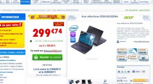 Si vous cherchez un pc portable pas cher, cdiscount semble etre la seule boutique en ligne à en proposer un à moins de 300 euros actuellement .. l’Acer eMachines E528-922G25Mn est une machine d’entrée de gamme disposant du minimum (2Go de memoire vive , 250 Go de disque dur , wifi , graveur de dvd , processeur celeron 925 , ecran 15 pouces ..) qui permet sans probleme d’executer toutes les taches bureautiques courantes et d’acceder à internet sans probleme ..