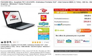 Si vous cherchez un pc portable à moins de 300 euros, il semble bien que le meilleur prix trouvable se trouve du coté de rueducommerce : en effet PACKARD BELL EasyNote TE11-HC-010FR est proposé à 299 euros mais en utilisant le code promo SUPER10 on gagne 10 euros et le prix passe alors à 289 euros ..
